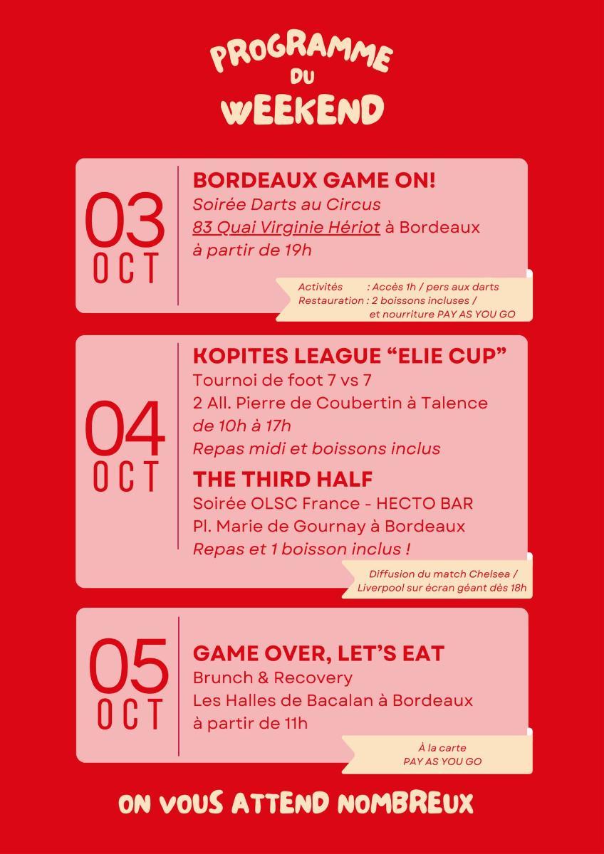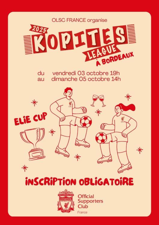WEEK-END KOPITES LEAGUE - OLSC FRANCE ! Le projet du tournoi inter régions a vu le jour il y a maintenant 4 ans en Rhônes-Alpes. Puis deux ans après il a prit la route vers l’Alsace lors de la 2ieme édition. Cette année, l’édition 3 aura lieu en Nouvelle Aquitaine et plus précisément à Bordeaux ! Après le succès des éditions 1 et 2, Bordeaux a du pain sur la planche pour vous offrir le meilleur week-end possible ! L'objectif de ce tournoi est avant tout de réunir une bonne partie des membres OLSC France. Que vous souhaitiez jouer, donner un coup de main ou simplement encourager les équipes, chaque présence compte pour faire de cette 3e édition un moment inoubliable. La Kopites League approche à grands pas et nous avons hâte de vous retrouver à Bordeaux les 3, 4 et 5 octobre 2025 pour un week-end 100% Reds 🔴 ! C’est un weekend majeur pour notre association OLSC France ! 👉 Petit rappel important : l’inscription est obligatoire pour participer, et la date limite est fixée au 24 septembre 2025. Sans inscription, il ne sera pas possible de prendre part au tournoi ou aux activités du vendredi et samedi. 💸 Tarif : 20 € par personne (comprends le vendredi soir avec 2 boissons et 1h de darts, le tournoi avec repas midi et boissons, le repas du soir et sa boisson). Même si tu ne participes pas en tant que joueur au tournoi ou que tu seras présent uniquement le samedi soir : le paiement de 20 euros est obligatoire. Au programme : ⚽ Un grand tournoi de football entre Kopites venus de toute la France 🍻 Des moments conviviaux entre passionnés du LFC 🎶 Une ambiance unique version bordelaise ! Et n’oubliez pas : l’événement est ouvert à tous les fans de Liverpool, pas seulement aux membres de l’association. Alors ramenez vos amis Reds ! Petite subtilité quand même, si vous souhaitez constituer une équipe, il faudra que cette dernière soit composée de 80% de membres OLSC France à minima. ✅ Alors c'est bon ? Tu viens ? Toooooop voici les étapes : -> Inscription obligatoire via le sondage (ci dessous) pour participer au weekend : https://docs.google.com/forms/d/e/1FAIpQLScEe82OJ5vuLifbDPtejl8vdq76wuj7UAwnStP0Pow9IYKRKQ/viewform?fbclid=PAZnRzaAMsBadleHRuA2FlbQIxMQABp6eL2DlYGxevgLxaDnm0zT_cp8_54P8oe5hhVBByNV-fDgDd7rFqelCu8QHx_aem_ejqmq-DhZ7ihOXuLNw-NYg -> Paiement obligatoire pour valider son inscription : 20 € par personne https://liverpoolfrance-olscfrance.assoconnect.com/collect/description/592036-k-tournoi-de-bordeaux-week-end-du-3-au-5-octobre-2025?fbclid=PAZnRzaAMsBchleHRuA2FlbQIxMQABp7z0p4JhfzsTi-NeACvSyOxC9BxB_7LYDWJQnVW1ywhn44FJYie3j5NWrjKV_aem_hDyPbgfr-q7wXZZW_2OUuw Date limite d'inscription et de paiement : 24 septembre 2025 Si besoin de renseignements complémentaires n’hésitez pas à poser des questions via le forum ou directement en MP ou sur Instagram/facebook YNWA