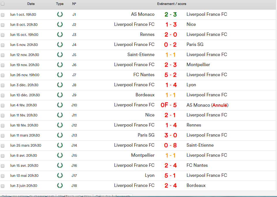 6) Historique Championnat des Supporters : Saison 2011-12 : LIVERPOOL FRANCE FC 2011-12 Debout (de gauche à droite) : Antoine, Gian, Adam, Jeremy R, Jean-Baptiste, Brandon, Mickaël, Jeremy P, Xavier Assis (de gauche à droite) : Ronan, Hugo, Yoann, Arnaud, Geoffrey Résultats : Classement : Buteurs : Saison 2012-13 : LIVERPOOL FRANCE FC 2012-13 Debout (de gauche à droite) : Alban, Brandon, Julien, Jean-Baptiste, Cheikh, Olivier, Gian Assis (de gauche à droite) : Hugo, Yoann, Jeremy P, Jeremy R, Arnaud, Jérôme, Xavier, Ronan Résultats : Classement : Buteurs : Saison 2013-14 : LIVERPOOL FRANCE FC 2013-14 Debout (de gauche à droite) : Ronan, Marvyn, Brandon, Loik, Julien, Gian, Cheikh, Souleymane Assis (de gauche à droite) : Jeremy R, Arnaud, Jeremy P, Yoann, Alban Résultats : Classement : Buteurs : Saison 2014-15 : LIVERPOOL FRANCE FC 2014-15 Debout (de gauche à droite) : Adam, Jérôme, Arnaud, Julien, Charles, Olivier, Souley G, Jeremy P, Souley L, Florian, Yann, Hugo Assis (de gauche à droite) : Tsiri, Ronan, Jeremy R, Yoann, Brandon, Jean-Baptiste, Hamza, Stan Résultats : Classement : Buteurs : Saison 2015-16 : LIVERPOOL FRANCE FC 2015-16 Debout (de gauche à droite) : Ulysse, Killian, Julien, Souleymane, Brandon, Yann, Ronan, Adam, Antoine, Yoann, Loik Assis (de gauche à droite) : Tsiri, Alexandre, Jérôme, Jeremy R, Hugo, Hamza Résultats : Classement : * Lokomotiv Brocciu sacré champion des supporters à la faveur d'un meilleur goal-average particulier Buteurs : Saison 2016-17 : LIVERPOOL FRANCE FC 2016-17 Debout (de gauche à droite) : Jeremy P, Ken, Adam, Thibault, Brandon, Marvyn, Jerold, Killian, Souleymane, Yoann, Bruno Assis (de gauche à droite) : Jeremy R, Salim, Hugo, Arnaud, Ronan, Charles Résultats : Classement : Buteurs : Saison 2017-18 : LIVERPOOL FRANCE FC 2017-18 Debout (de gauche à droite) : Emile, Sébastien, Souleymane, Adam, Loik, Brandon, Maxime, Maxence Assis (de gauche à droite) : Charles, Ronan, Yoann, Arnaud Résultats : Classement : Buteurs : Saison 2018-19 : A MAJ LIVERPOOL FRANCE FC 2018-19 Debout (de gauche à droite) : Emile, Sébastien, Souleymane, Adam, Loik, Brandon, Maxime, Maxence Assis (de gauche à droite) : Charles, Ronan, Yoann, Arnaud Résultats : A MAJ Classement : A MAJ Buteurs : A MAJ -