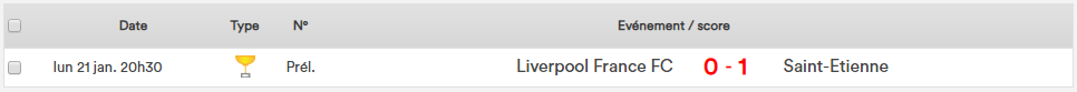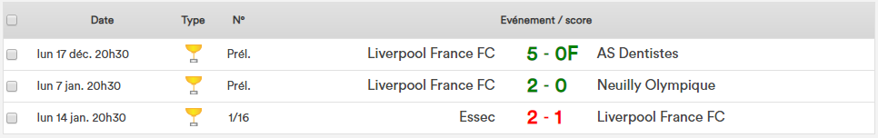 Coupe des Supporters : Saison 2013-14 : LIVERPOOL FRANCE FC 2013-14 Debout (de gauche à droite) : Pierre, Loik, Alban, Jeremy P, Adam, Jeremy R, Jérôme, Yoann, Souleymane, Brandon, Gian Assis (de gauche à droite) : Marvyn, Hugo, Ronan, Julien, Jean-Baptiste Saison 2014-15 : LIVERPOOL FRANCE FC 2014-15 Debout (de gauche à droite) : Salim, Brandon, Marvyn, Pierre, Loik, Jeremy R, Arnaud, Jean-Baptiste, Stan Assis (de gauche à droite) : Charles, Hamza, Jérôme, Adam, Hugo, Tsiri, Ronan * Bordeaux vainqueur 4-2 aux TAB Saison 2015-16 : LIVERPOOL FRANCE FC 2015-16 Debout (de gauche à droite) : Stan, Yann, Dylan, Julien, Yoann, Marvyn, Salim, Sebastien, Brandon, Nicolas Assis (de gauche à droite) : Jeremy R, Hamza, Hugo, Jerôme, Ronan, Alexandre, Jeremy P Saison 2016-17 : LIVERPOOL FRANCE FC 2016-17 Debout (de gauche à droite) : Julie, Charles, Brandon, Thibault, Souleymane, Mohamed Assis (de gauche à droite) : Dan, Victor, Salif, Jerôme, Ronan Saison 2017-18 : LIVERPOOL FRANCE FC 2017-18Debout (de gauche à droite) : Jeremy, Charles, Sébastien LG, Maxence, Brandon, Thibault, Sébastien P, Marvyn, EmileAssis (de gauche à droite) : Ronan, Adam, Arnaud, Gregoire, Hugo, Yoann Saison 2018-19 : Pas de coupe cette année-là -