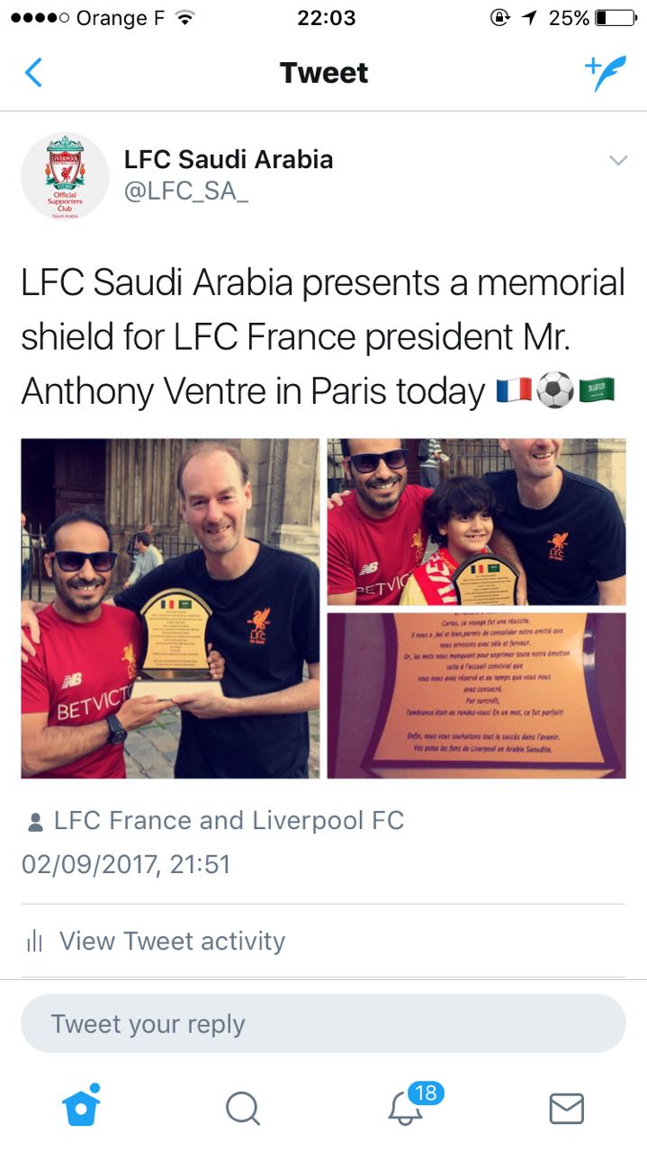 notre ami de la branch OLSC Saudi Arabia ete à Paris récemment pour nous présenter avec un jolie cadeaux de la part des membres là-bas, merci Jalawi et les Kopites Saudi !